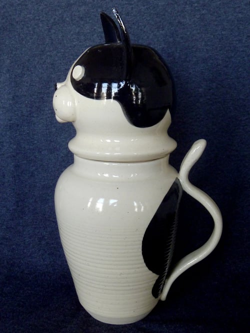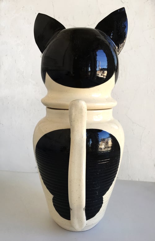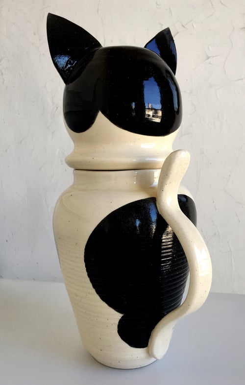 Reggie is a classy and dramatic 11" high X 6" wide jar, with a tail on his body and a lift-off head revealing storage space within. You may not want to stash your catnip in him, or your own tabby may reduce poor Reggie to a pile of broken pottery on the floor.